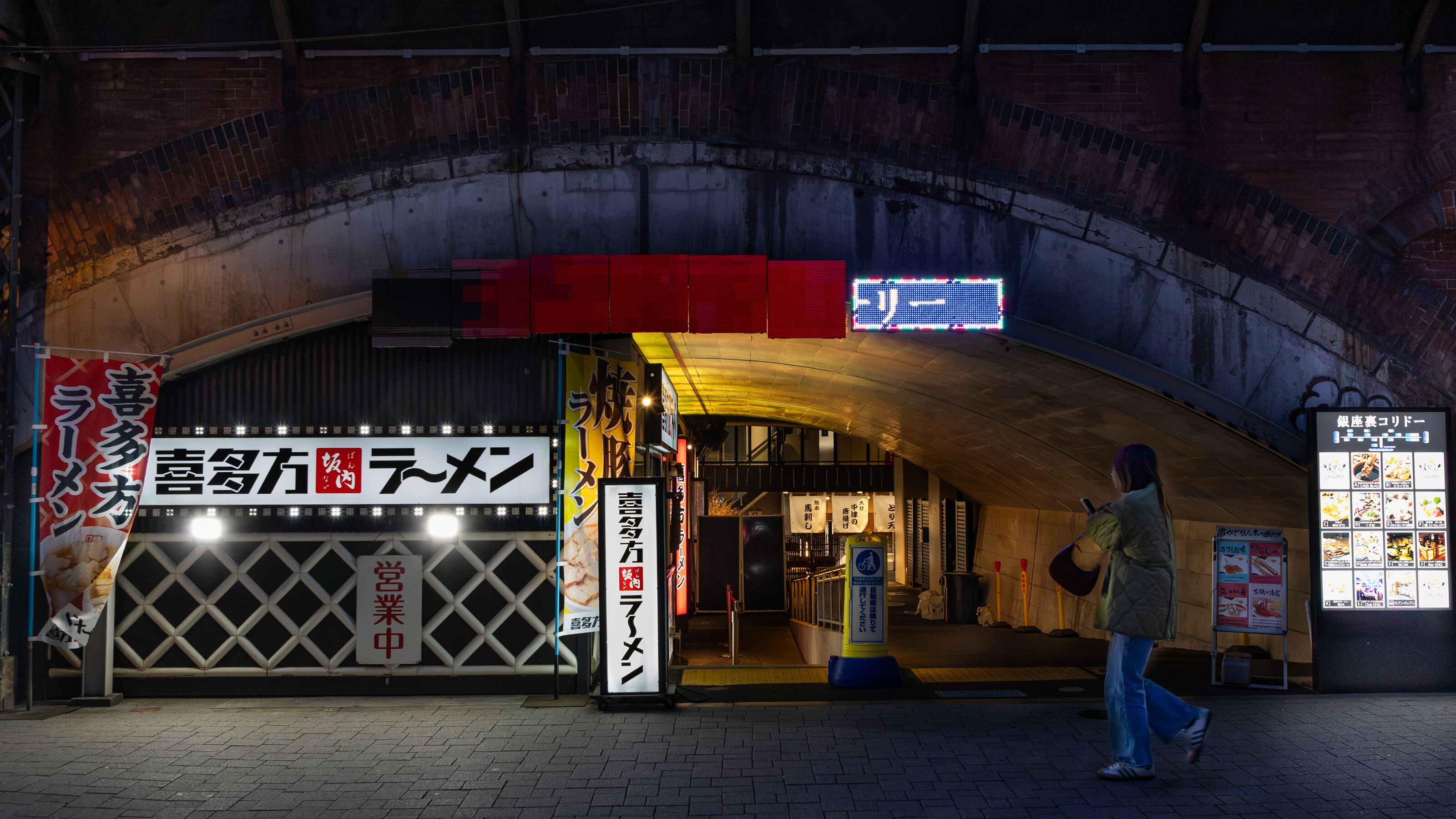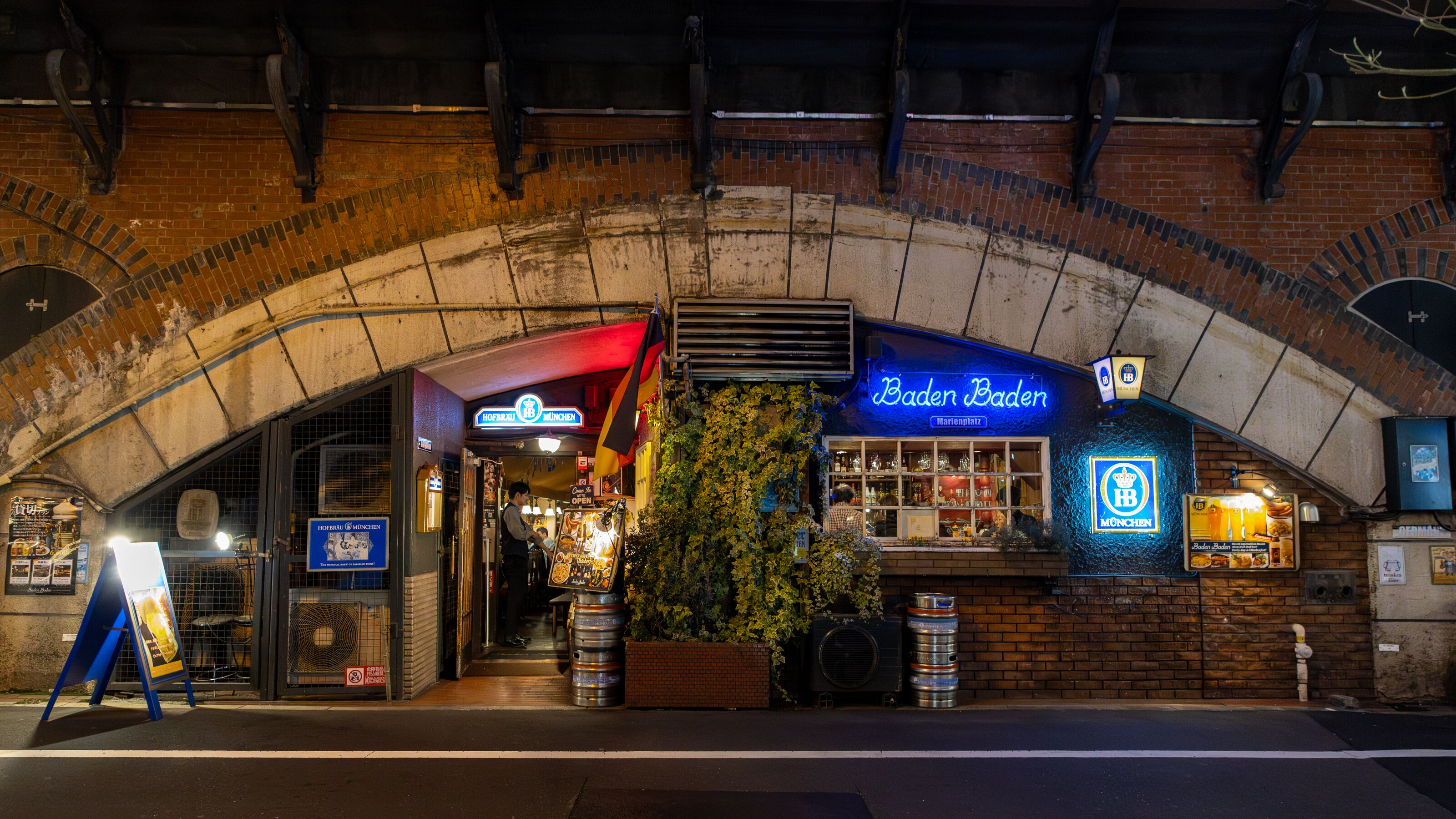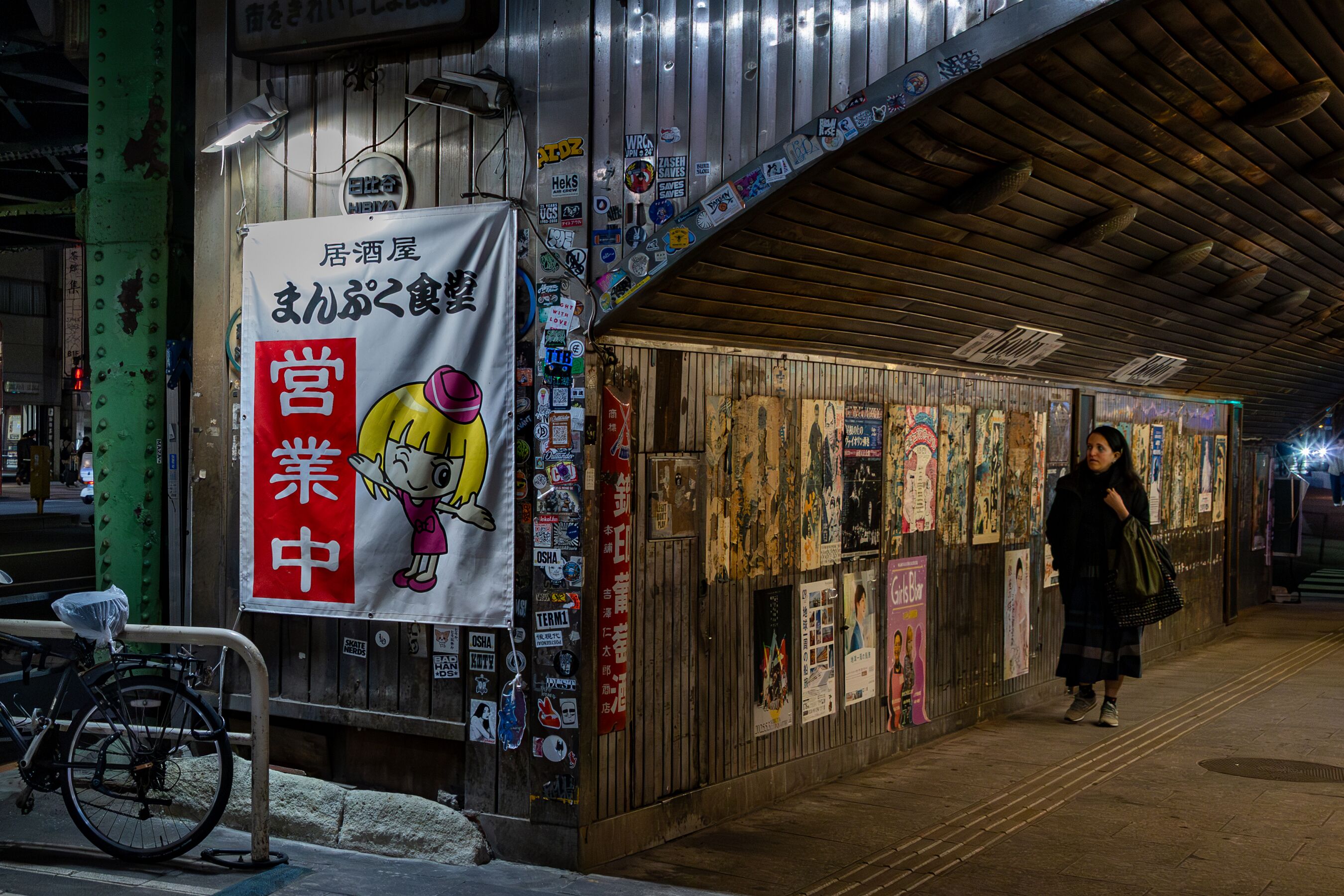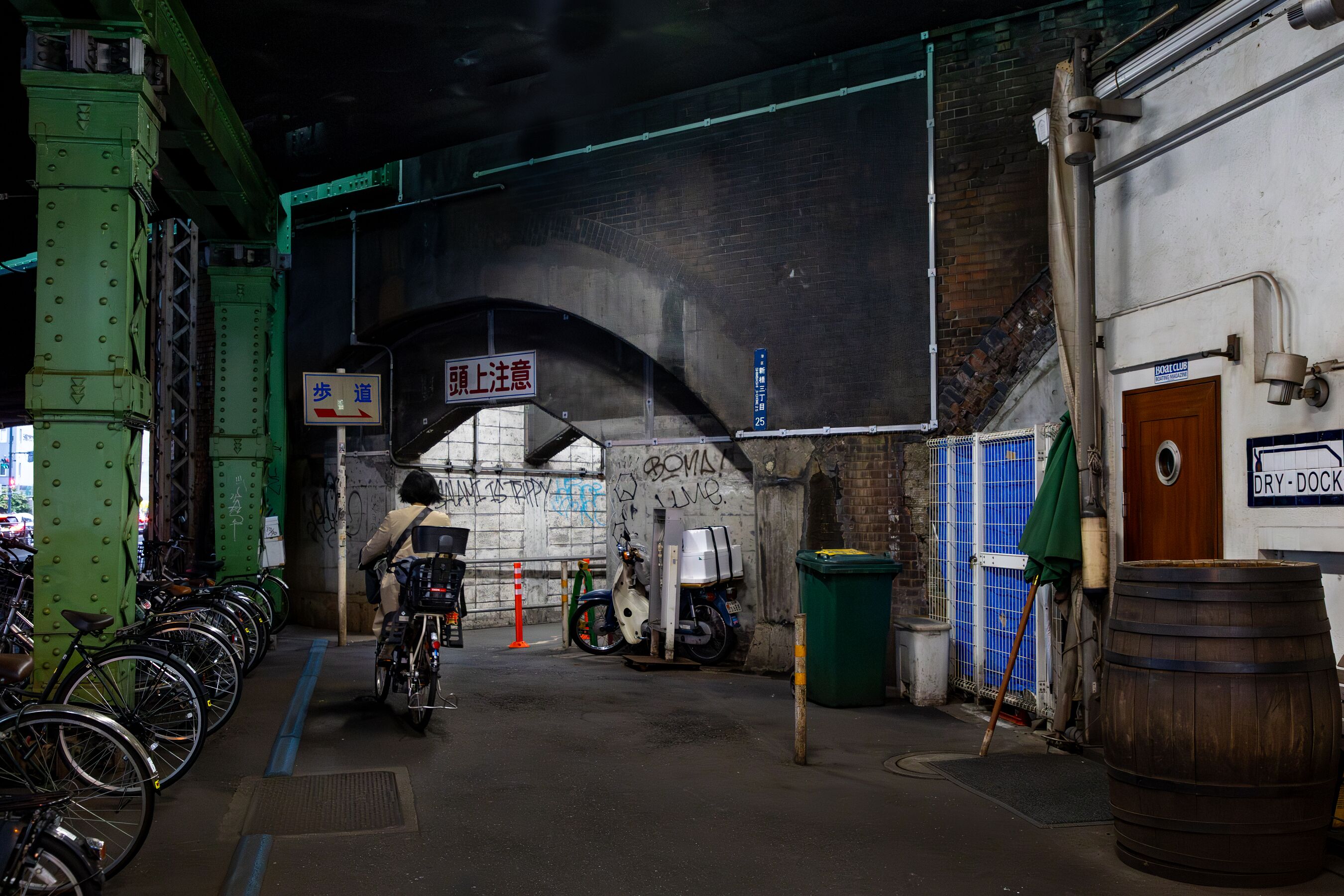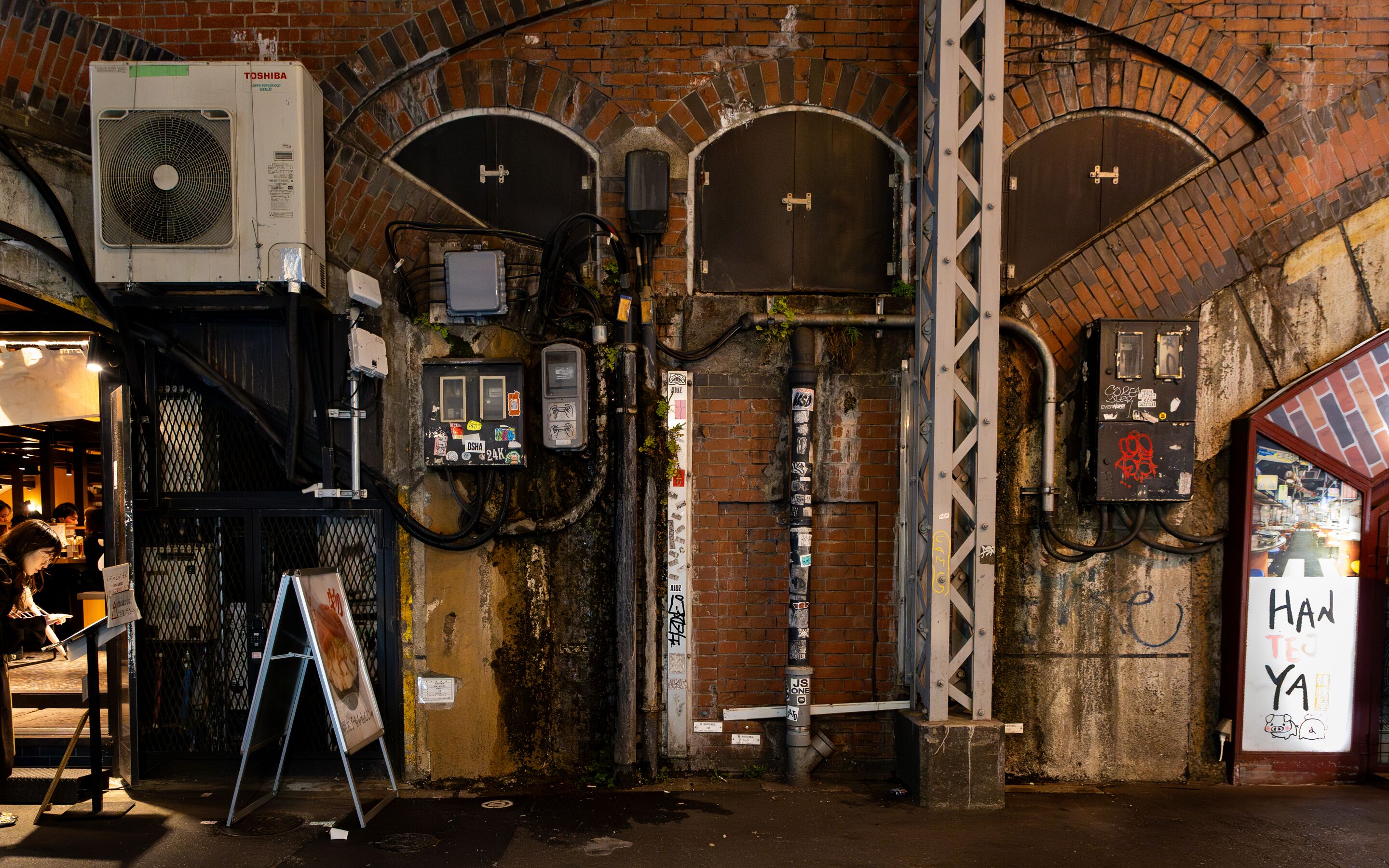 ・薄汚れた路地裏の佇まい、アーチ下の店舗が醸し出す夜の小宇宙、壁面に剥がれかけたポスター群——。再開発の波が押し寄せるこの界隈において、煉瓦アーチは変わりゆく東京と変わらぬ人々の営みを静かに見守り続けています。