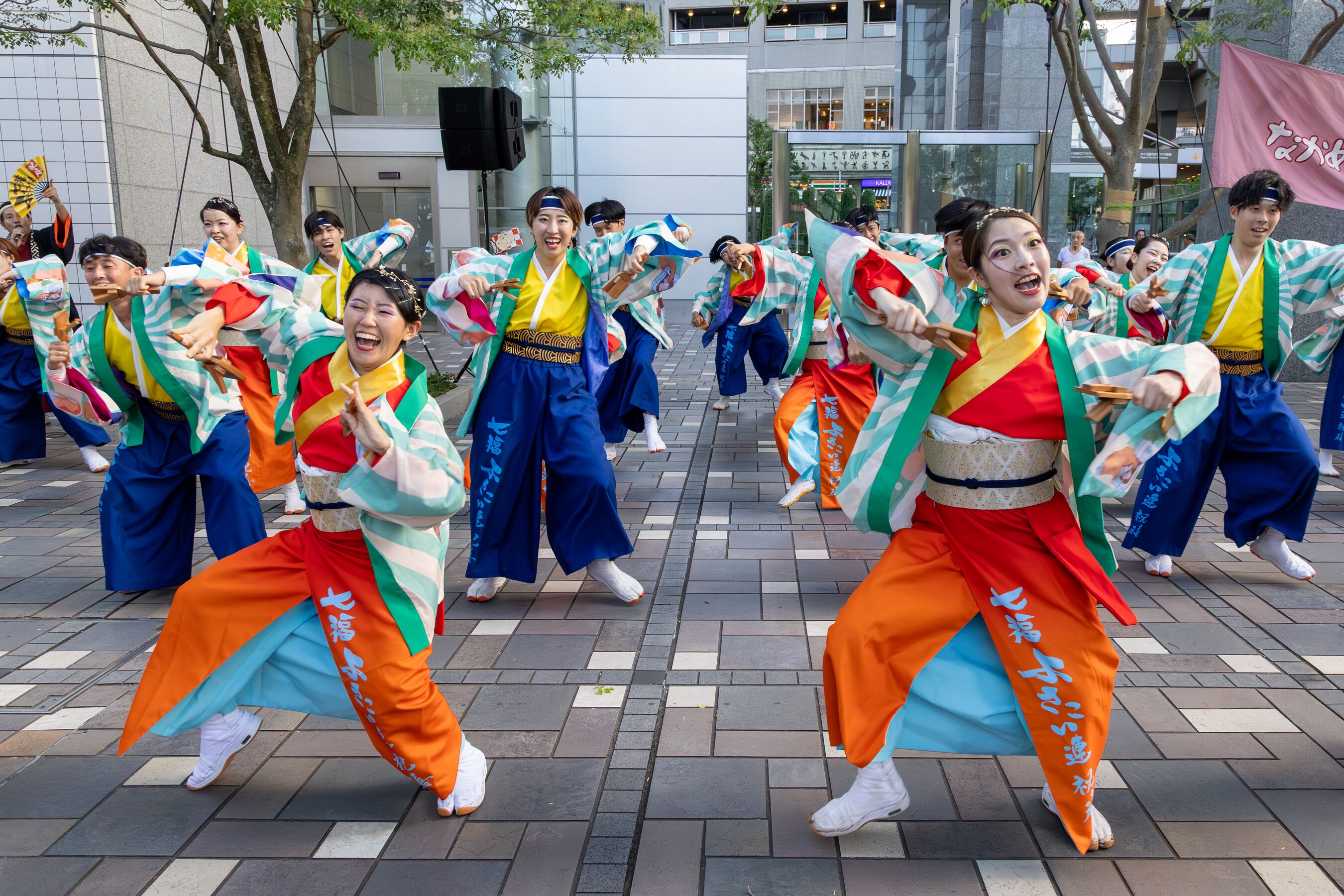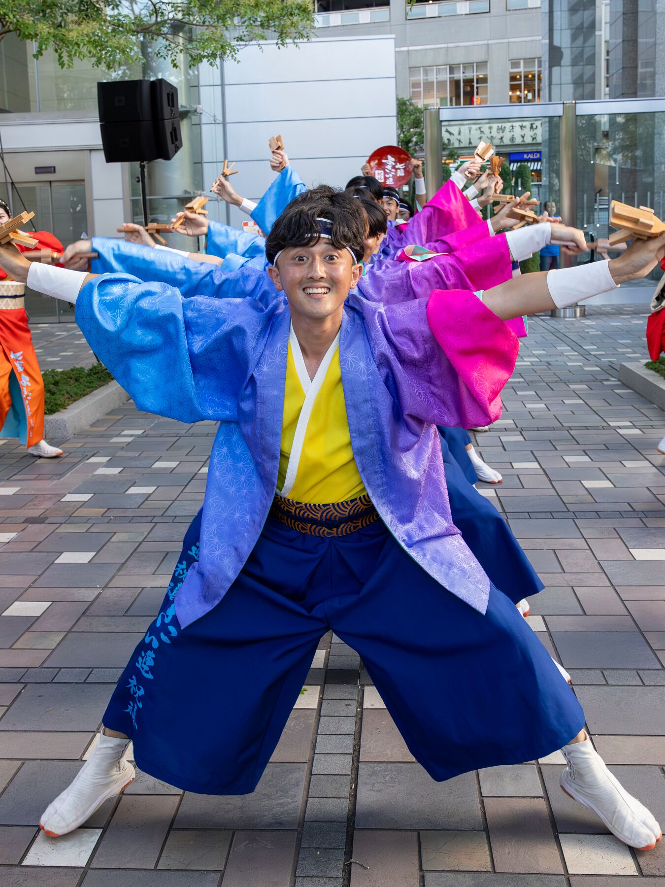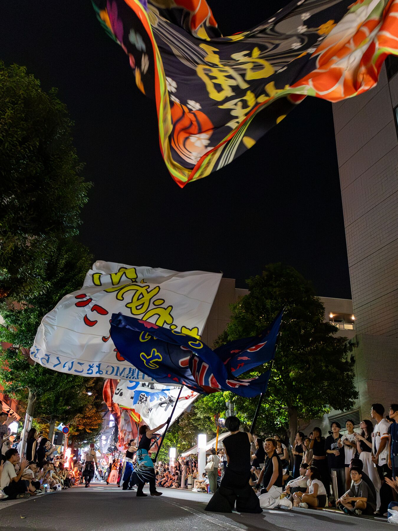 ・縦横無尽になびく「よさこい旗」と踊りが織りなす視覚的なドラマはこの祭りの圧巻です。